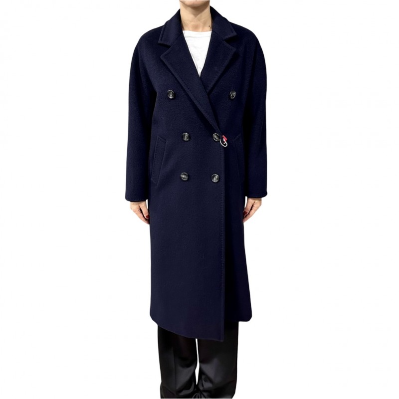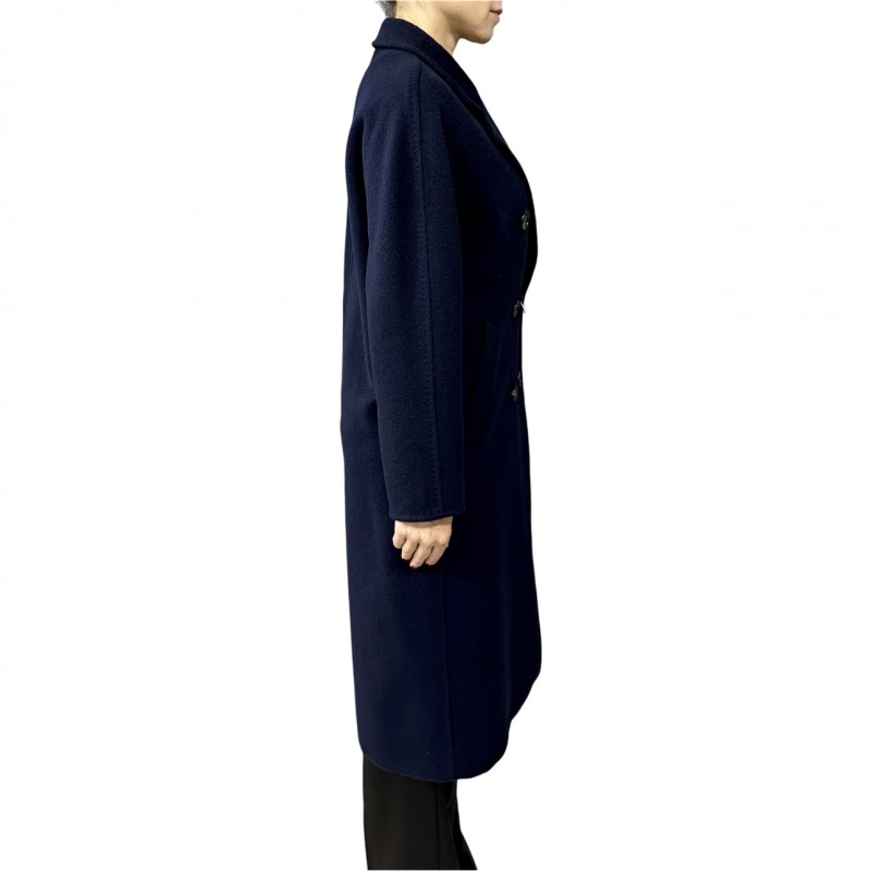 Cappotto donna doppiopetto con rever ampio e tasche a filettone, foderato. Cintura abbinata per evidenziare il punto vita. Un capo confortevole adatto a tutte le situazioni, realizzato in tessuto lana misto cachemire.