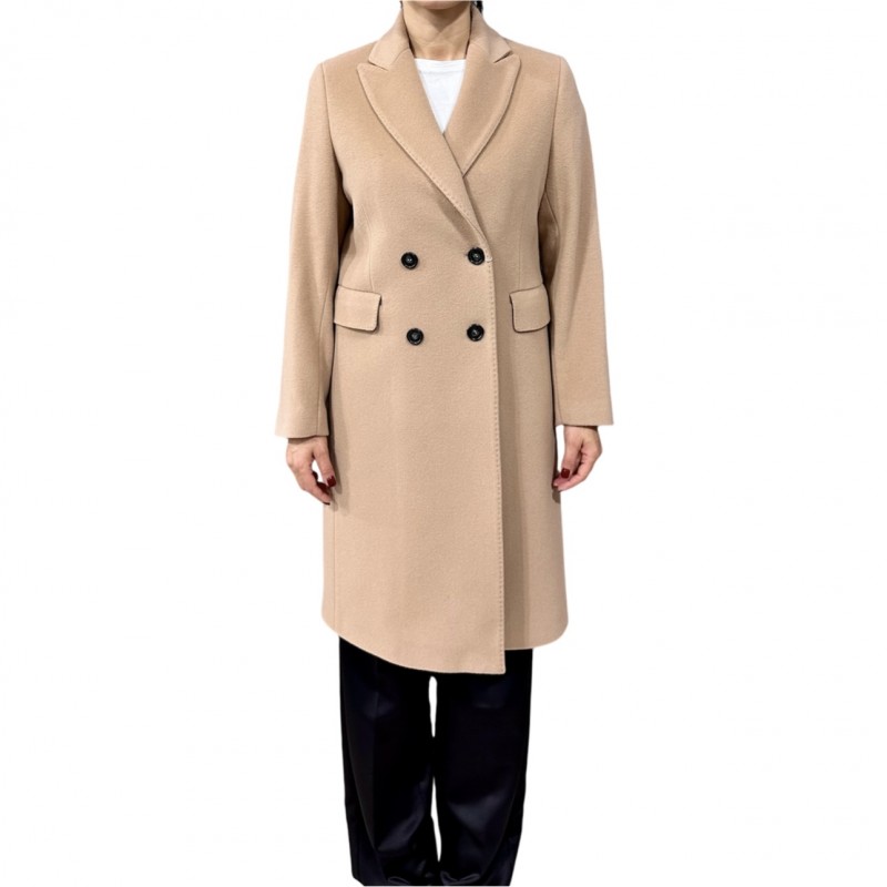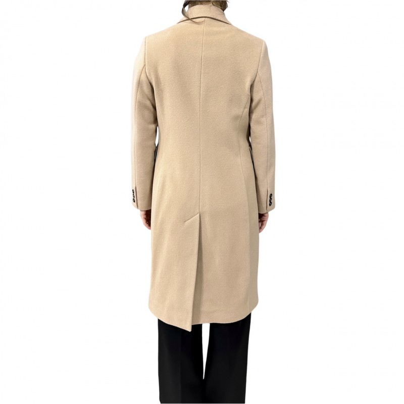 Cappotto donna doppiopetto con rever a lanica e tasche a pattina, foderato dalla linea slim. Un capo confortevole adatto a tutte le situazioni, realizzato in tessuto lana misto cachemire.